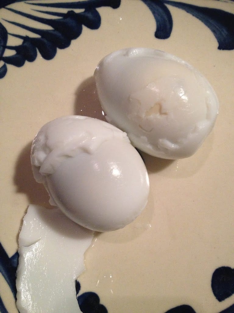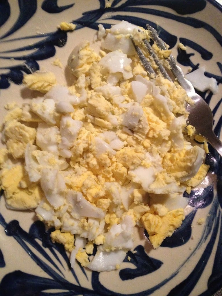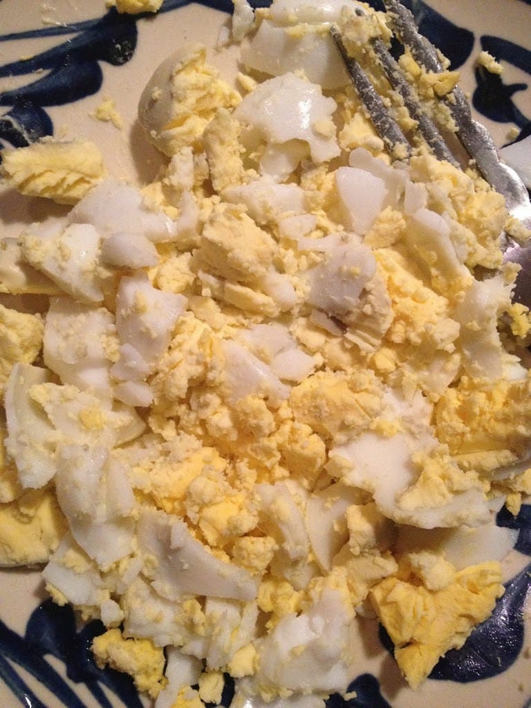 卵を茹でて,冷水にとった後,皮を剥いて,フォークでつぶします.