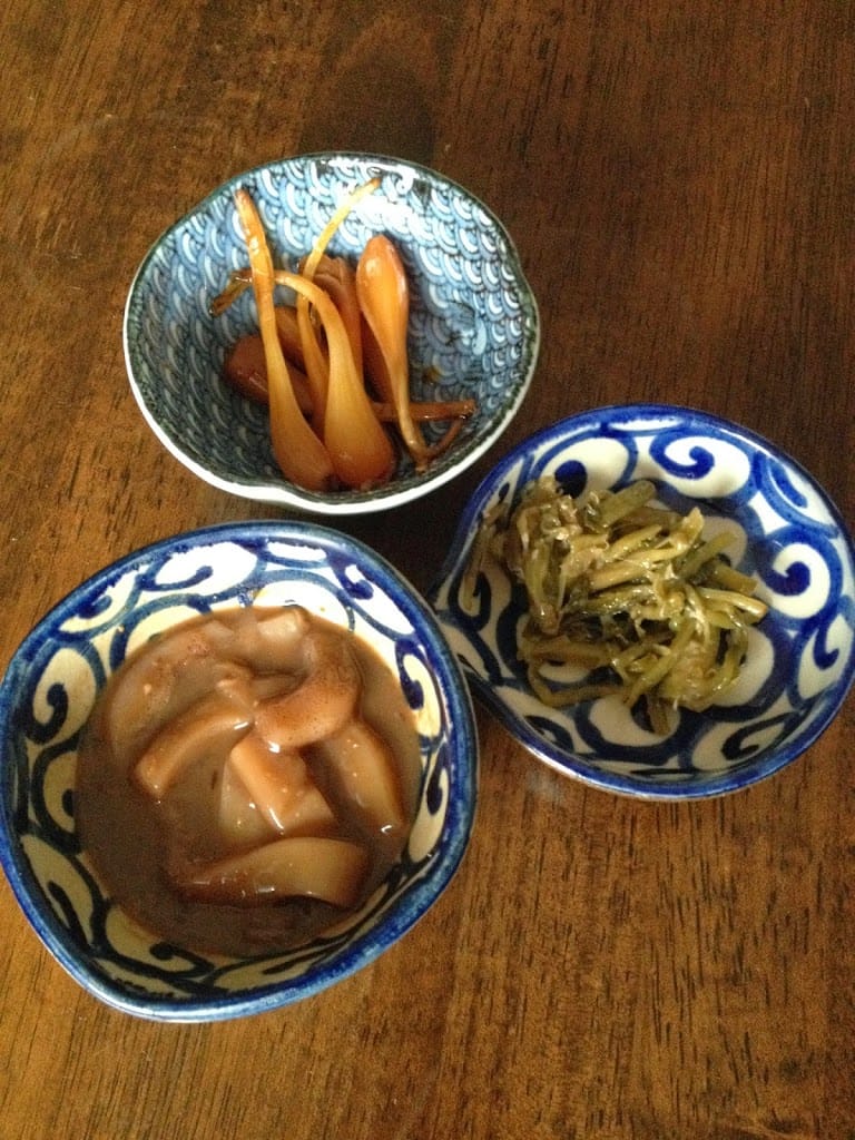イカの塩辛と島ラッキョウのタマリ漬け、ワサビ漬け |