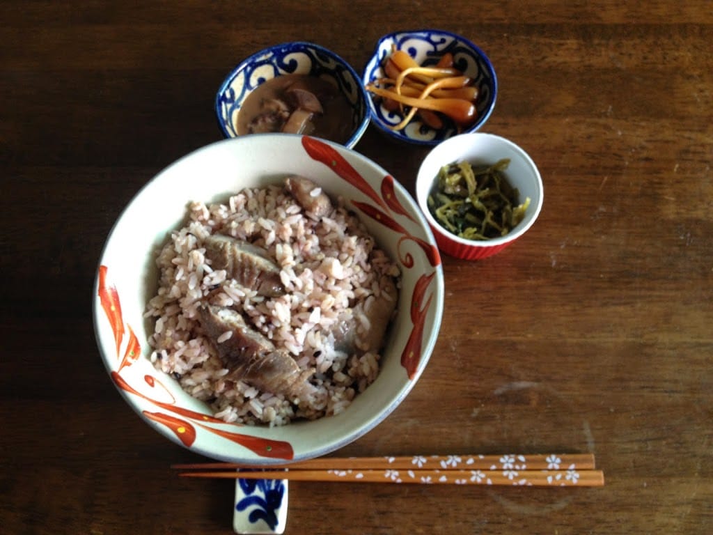 おかずは自作の島ラッキョウのタマリ漬け、もらったワサビ漬け、イカの塩辛っす。