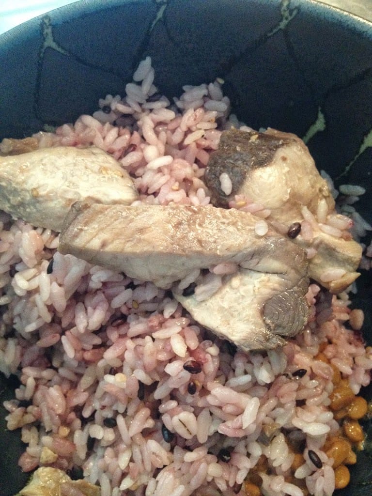カツオご飯にしようと思い、炊飯機の残り時間が3分で投入し、さっと混ぜて蓋を閉じます。