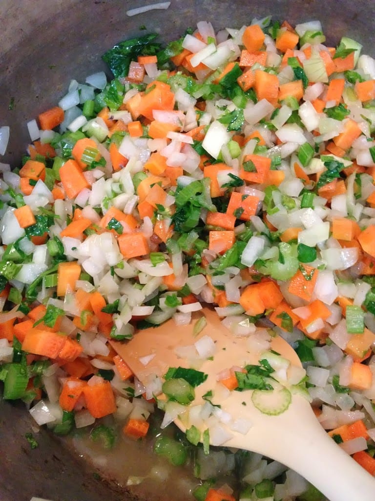 - 火を入れている間に、タマネギと人参、セロリをみじん切りにする。