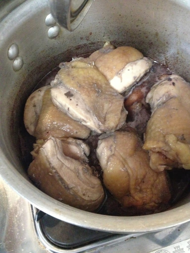 - テキトーに火が入った肉をワイン入り圧力鍋へ移してフタ、トロ火のまま。