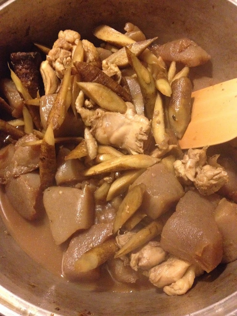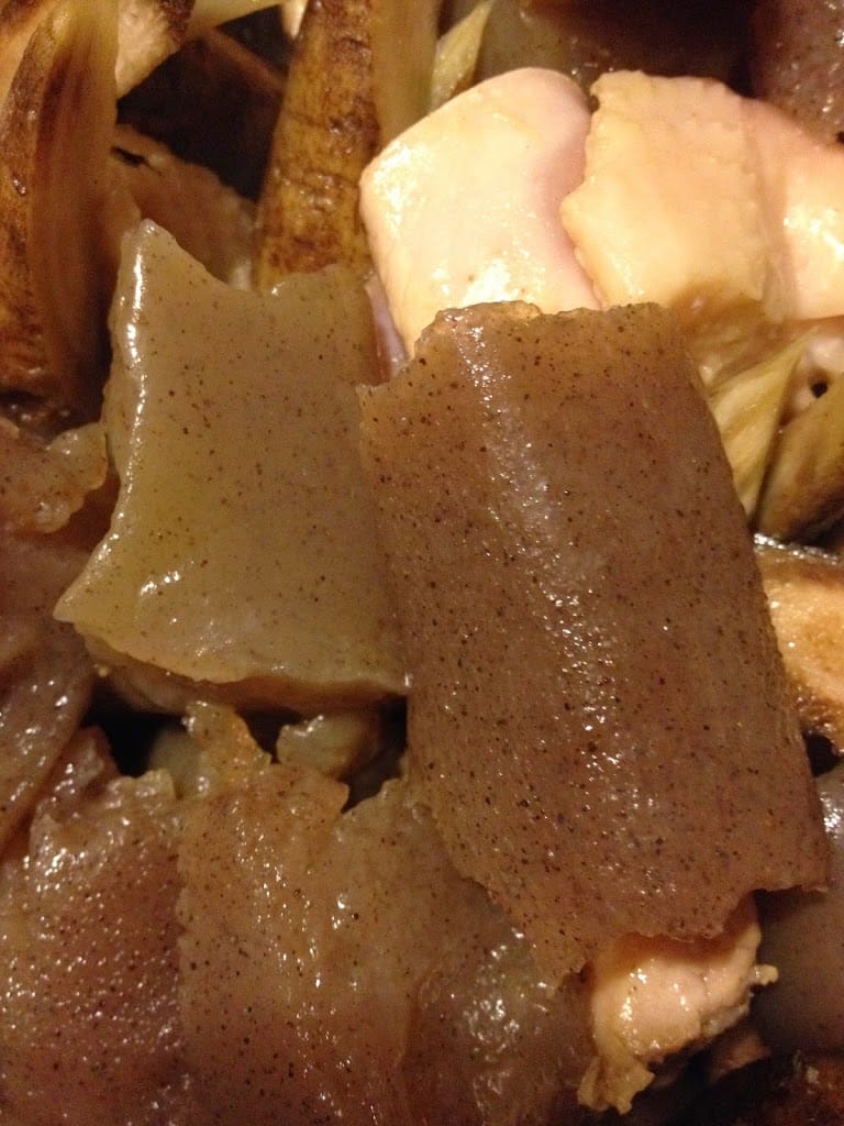 - 鳥の脂でコンニャクとゴボウをさっと炒める