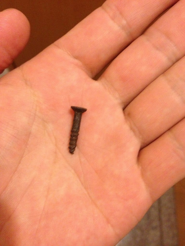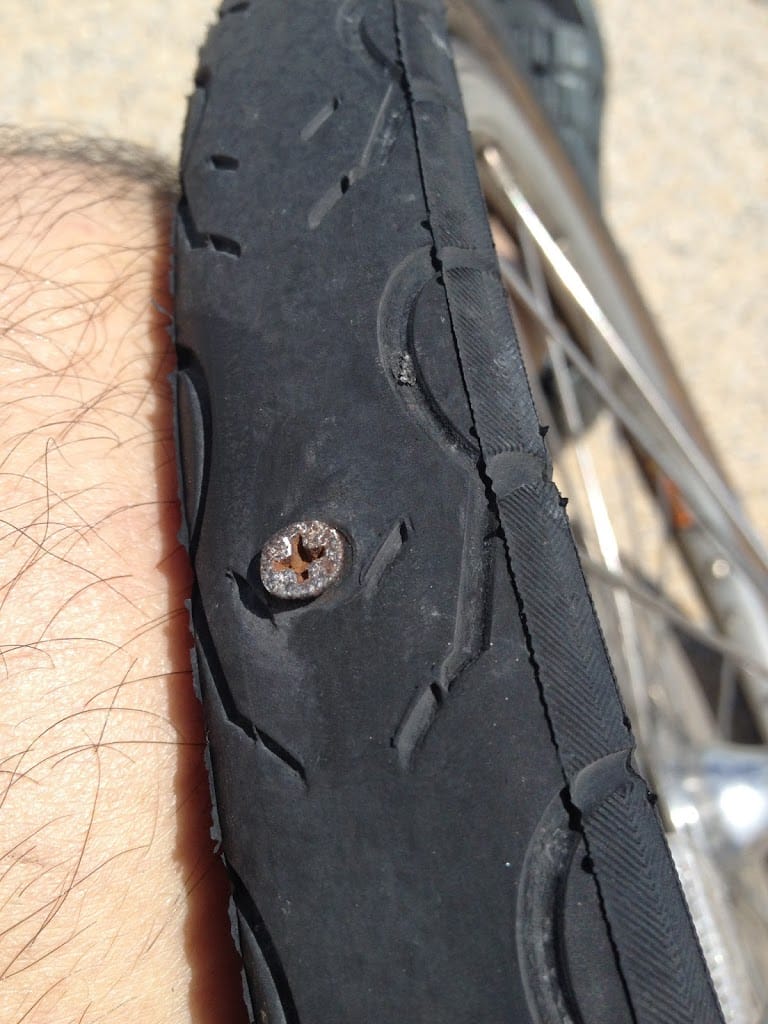 タイヤを見たら,ガッチリとビスが刺さっています.