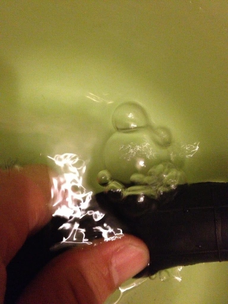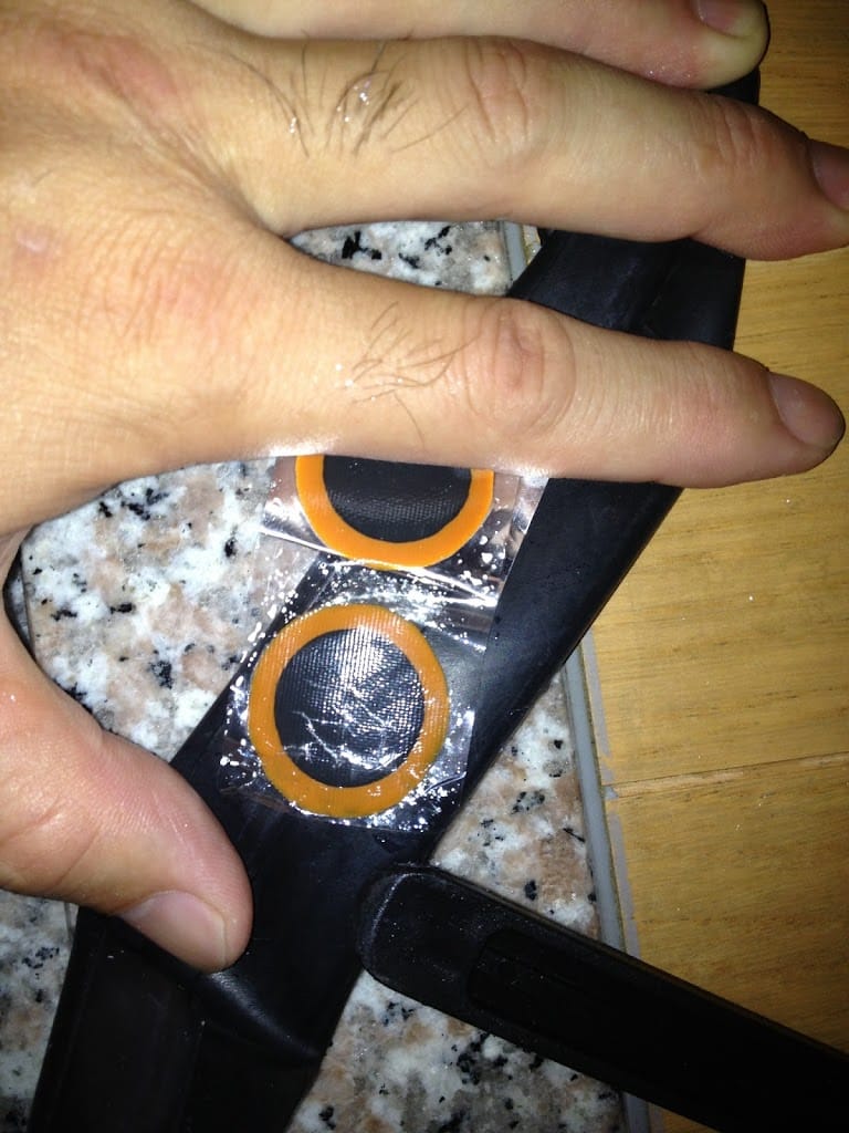 水を張ってエア漏れの場所を確認して,ヤスリでこすって,糊ぬって,パッチ貼って,こすって,チェックと.