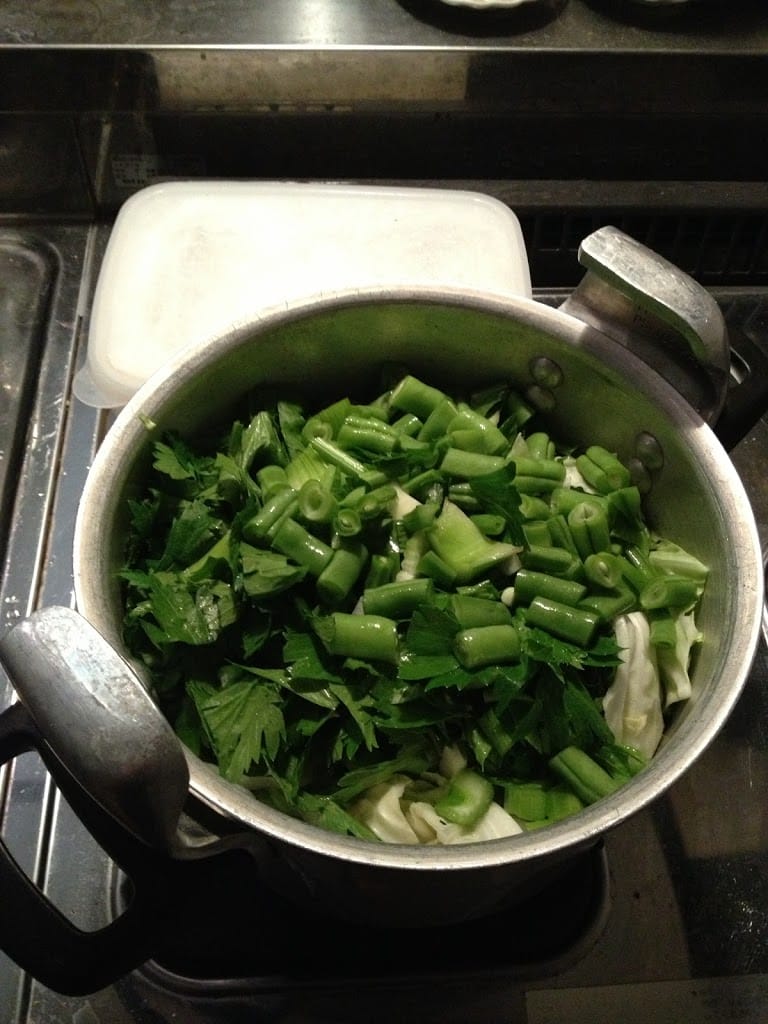 テキトーに切ったキャベツ,セロリ,インゲンを入れ,軽く塩して,攪拌して,弱火でフタ.