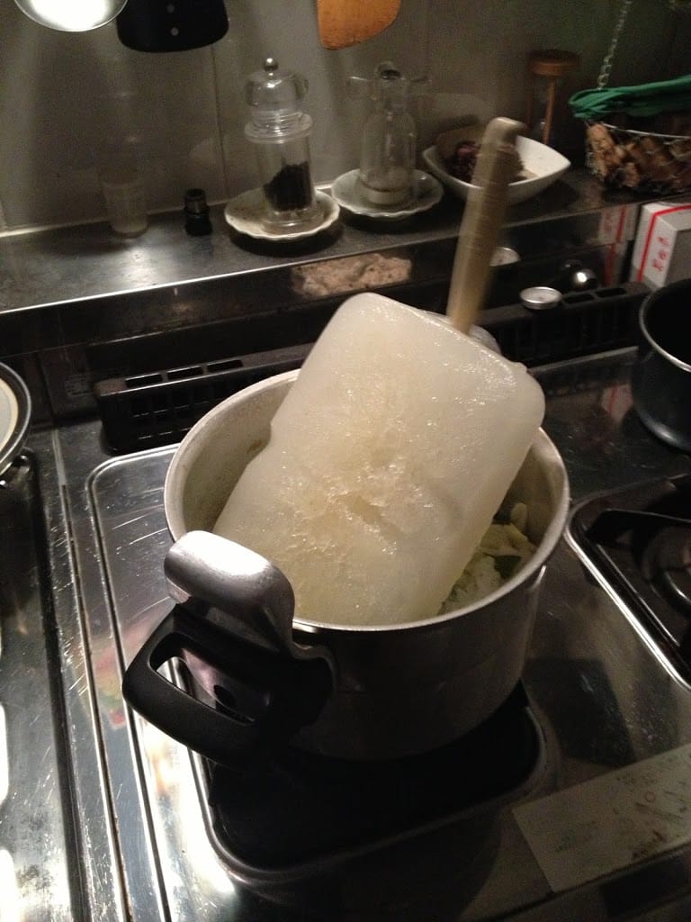 冷蔵庫で寝ていた自作ブイヨンをぶち込んで解凍.