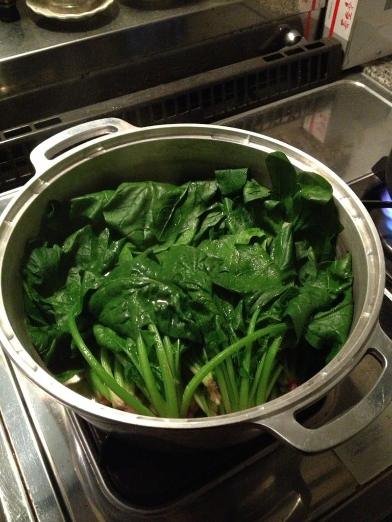 洗ったホウレンソウを予熱した無水鍋に入れ強火,蒸気が出てきたら火を止めて1分放置