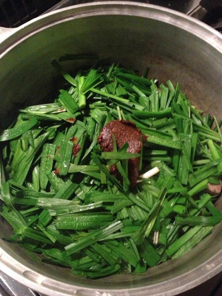 焼き色が両面についたら,ニラと葉ニンニク・焼酎・自家製味噌を入れ,中火
