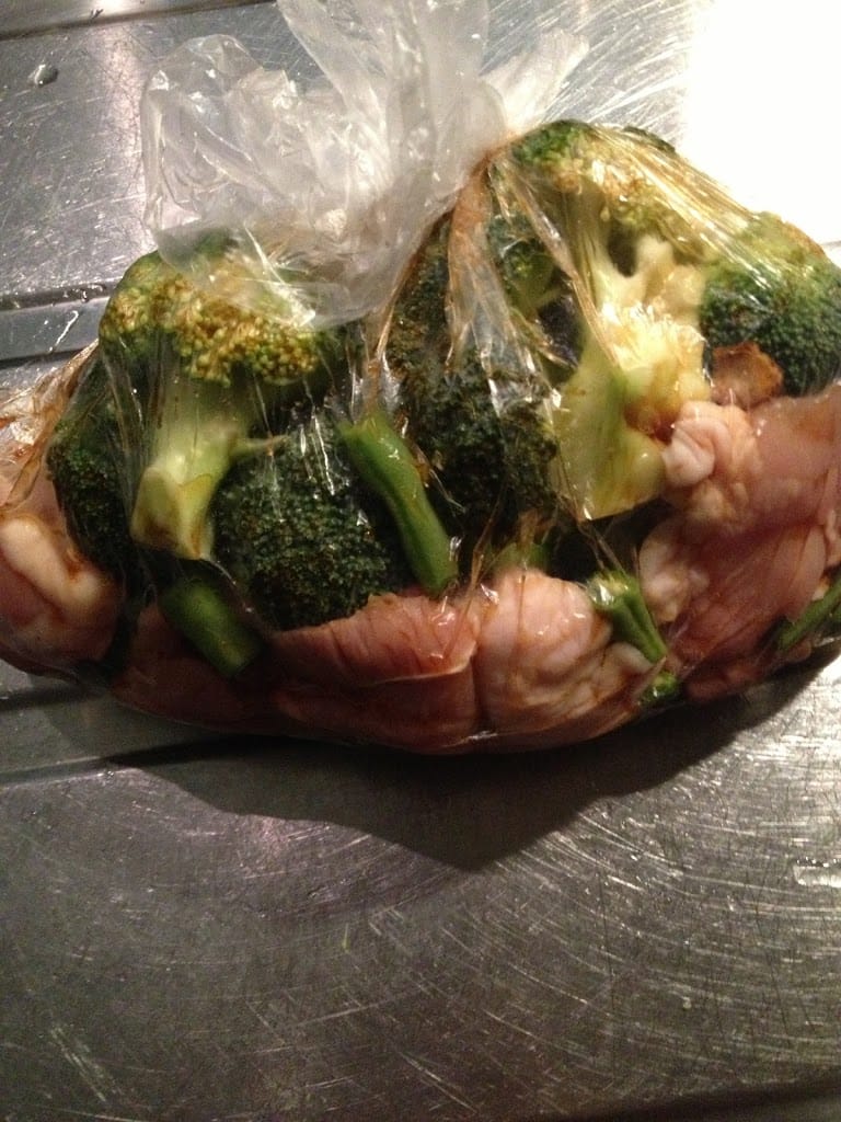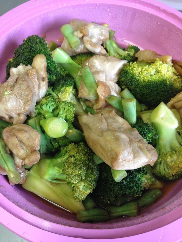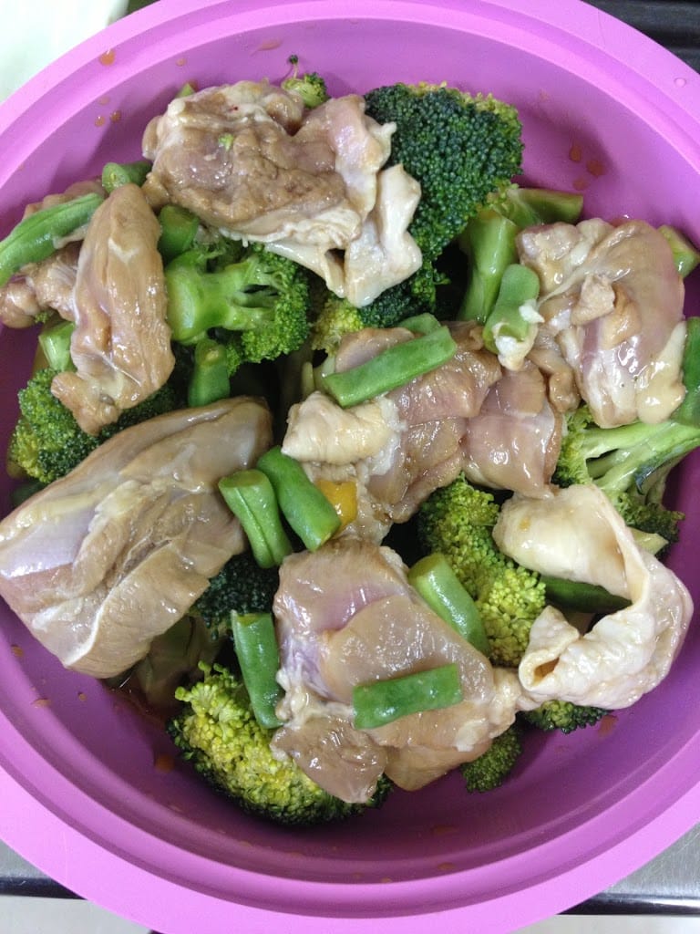 お昼:一晩焼酎と酢醤油に漬けた鶏肉・ブロッコリ・インゲンをシリコンスチーマーで