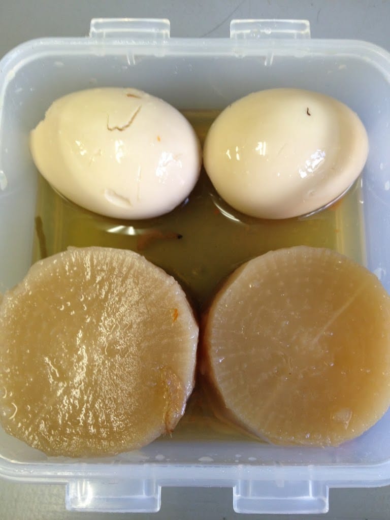 お昼:大根の煮物と,ゆで卵をそこで漬けたの