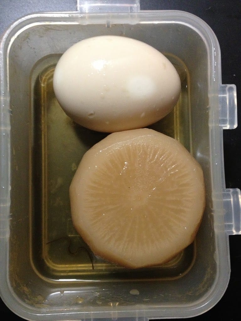 夕方:大根の煮物と,煮物に漬けたゆで卵