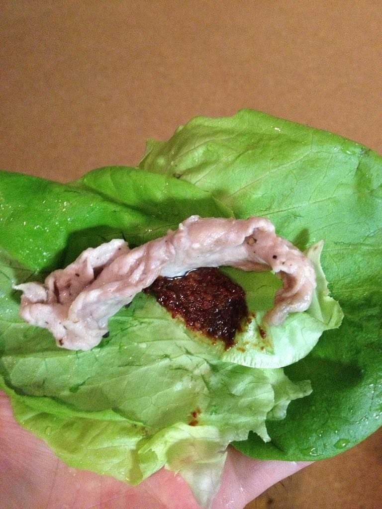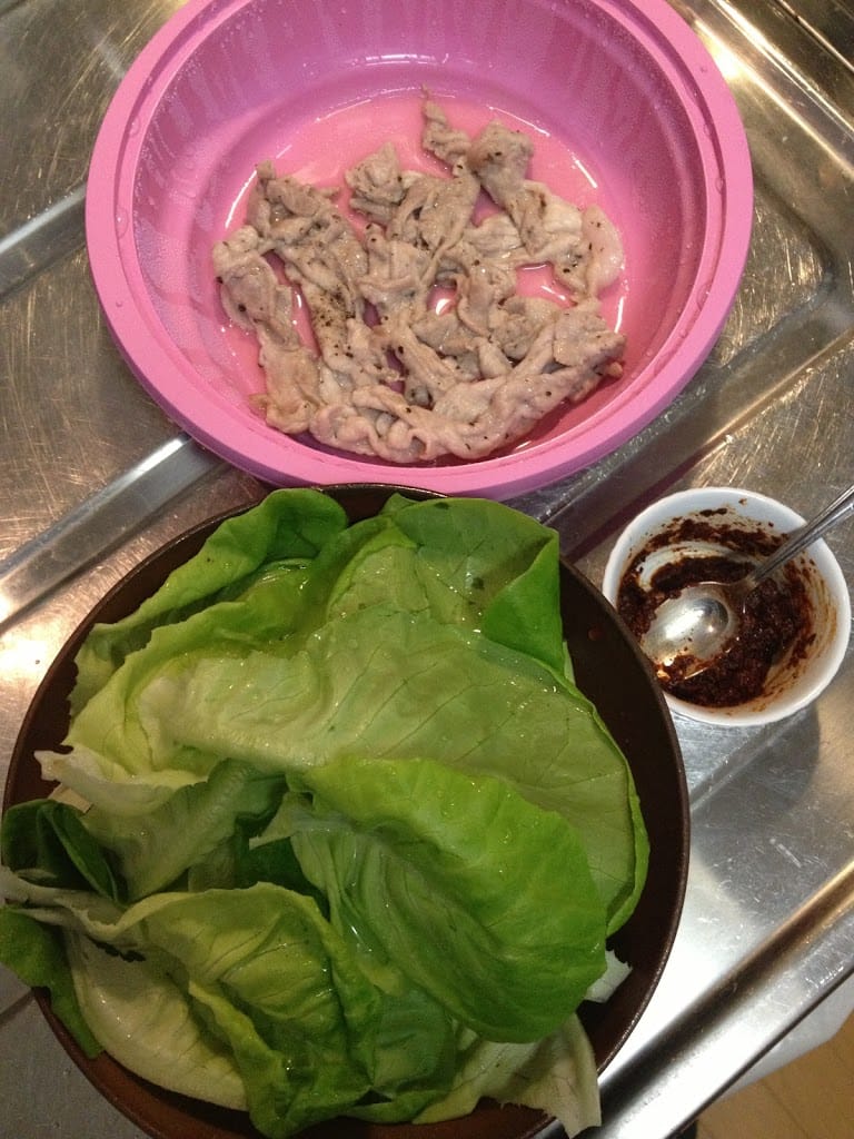 夜:豚肉とサラダ菜,一味と味噌ダレで