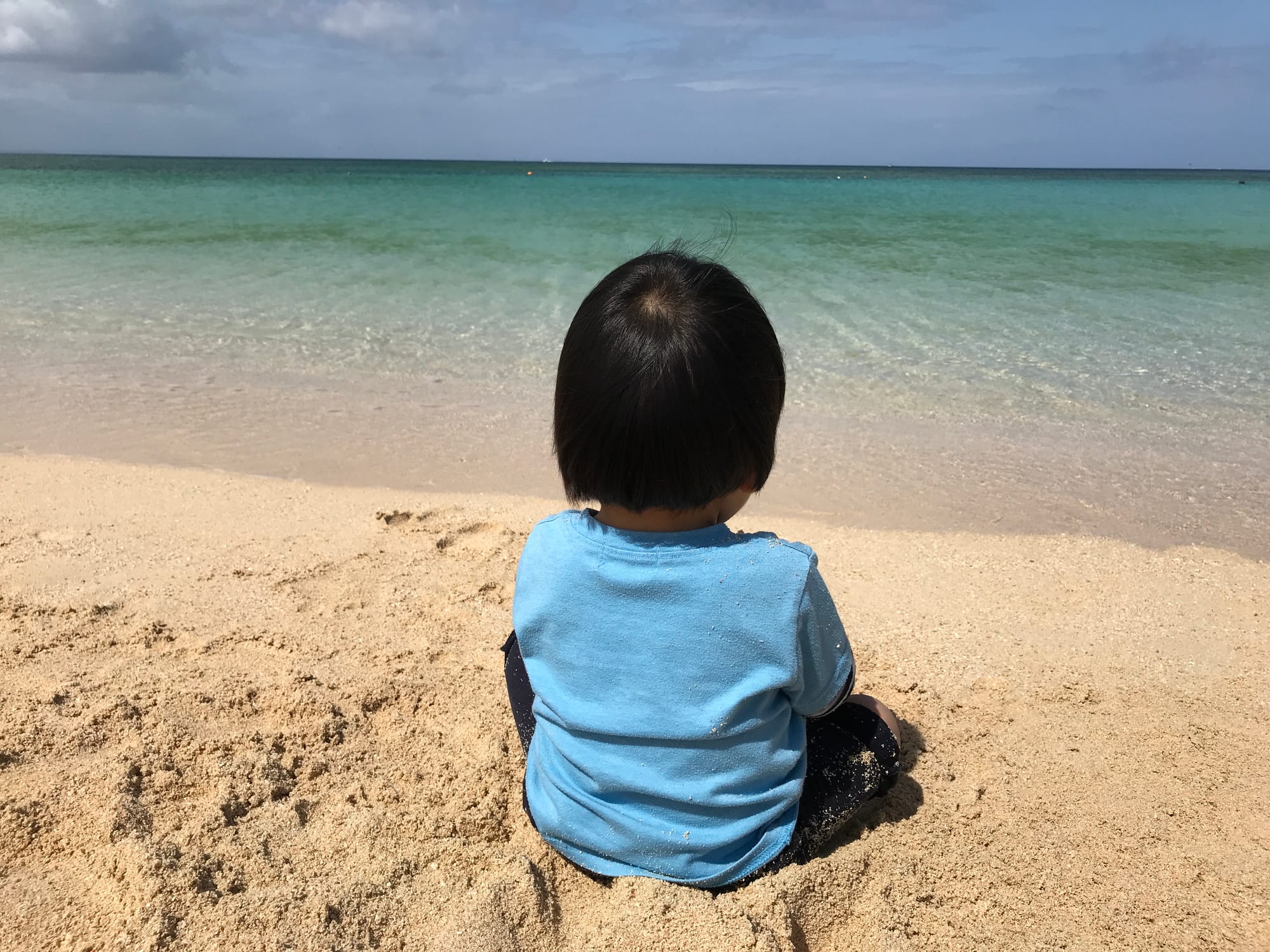 次男はまだよくわからない。砂浜で遠くを見ておりました。