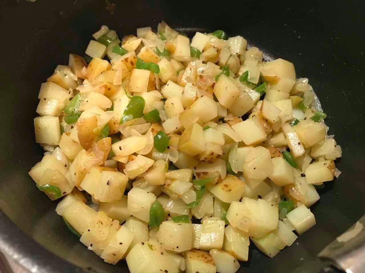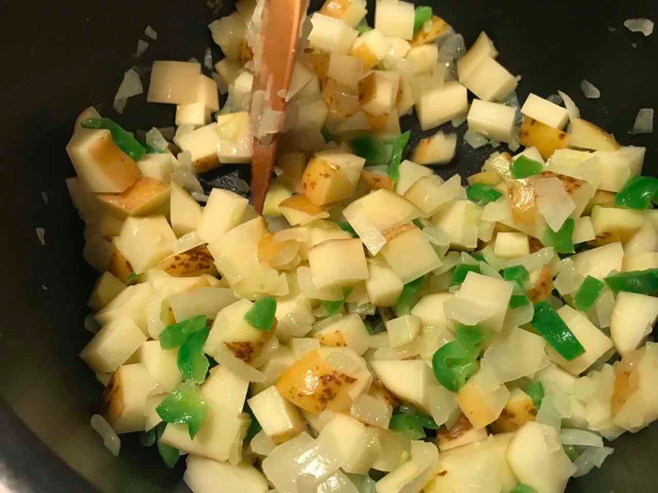 - ジャガイモをテキトーに切って、玉ねぎとともに炒める