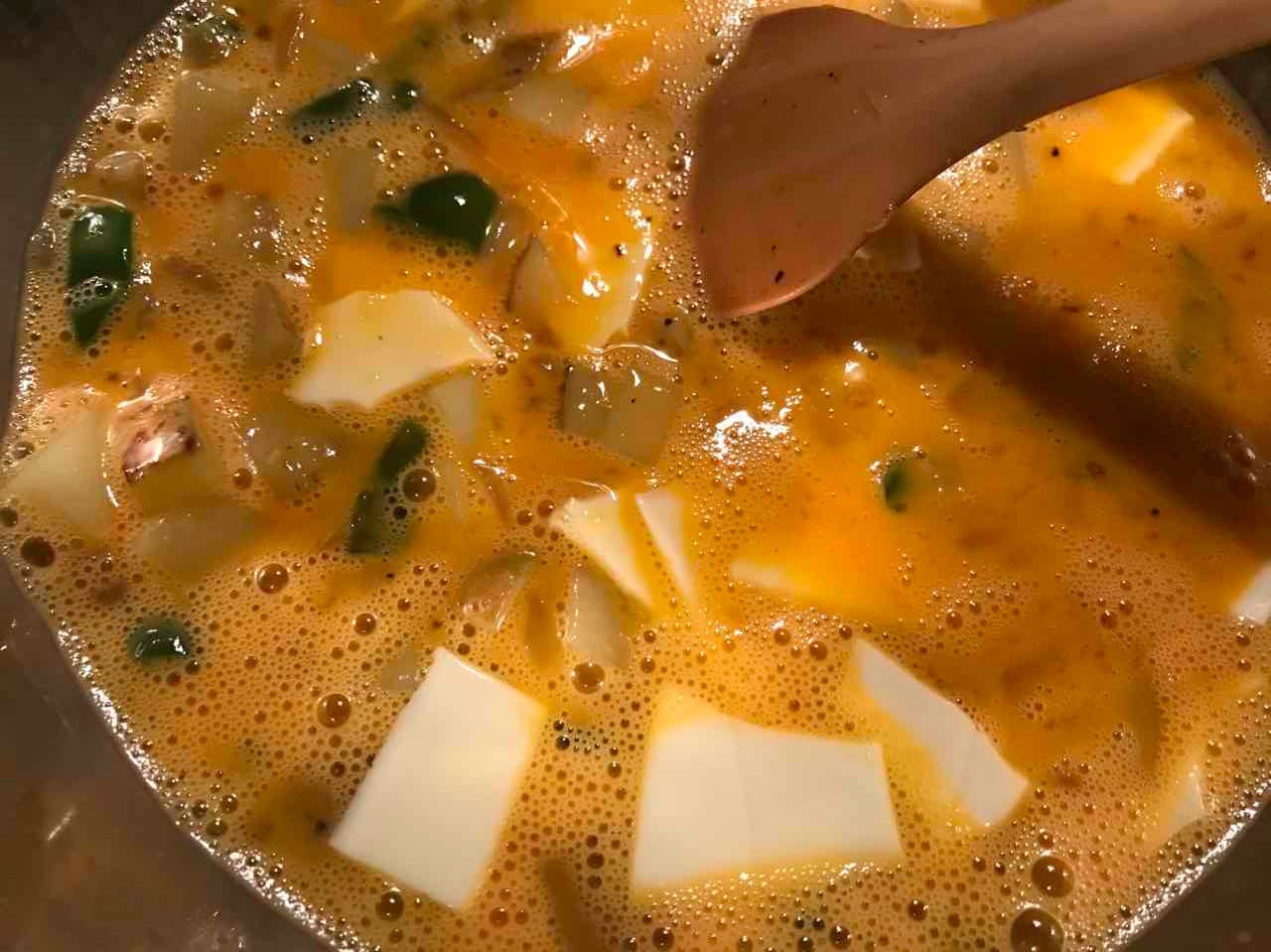 - 卵とチーズを入れて混ぜる。