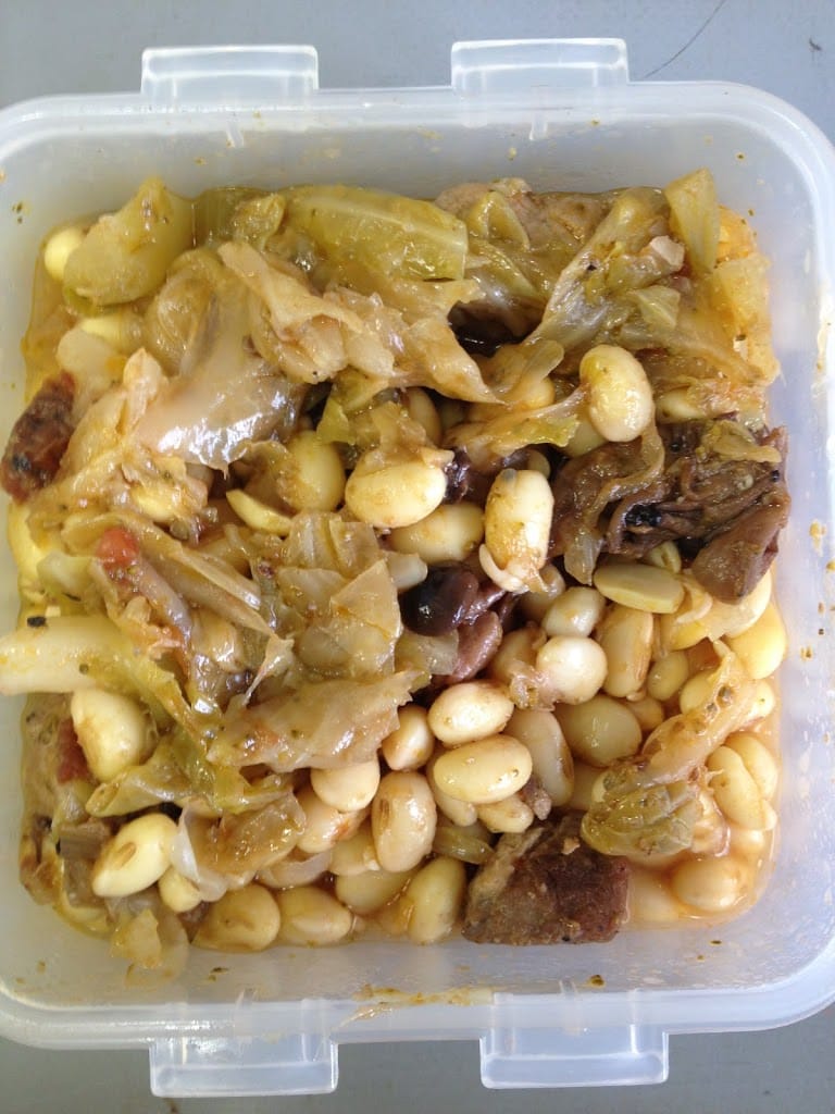 お昼:キャベツと豚肉のスープを煮大豆にかけたの