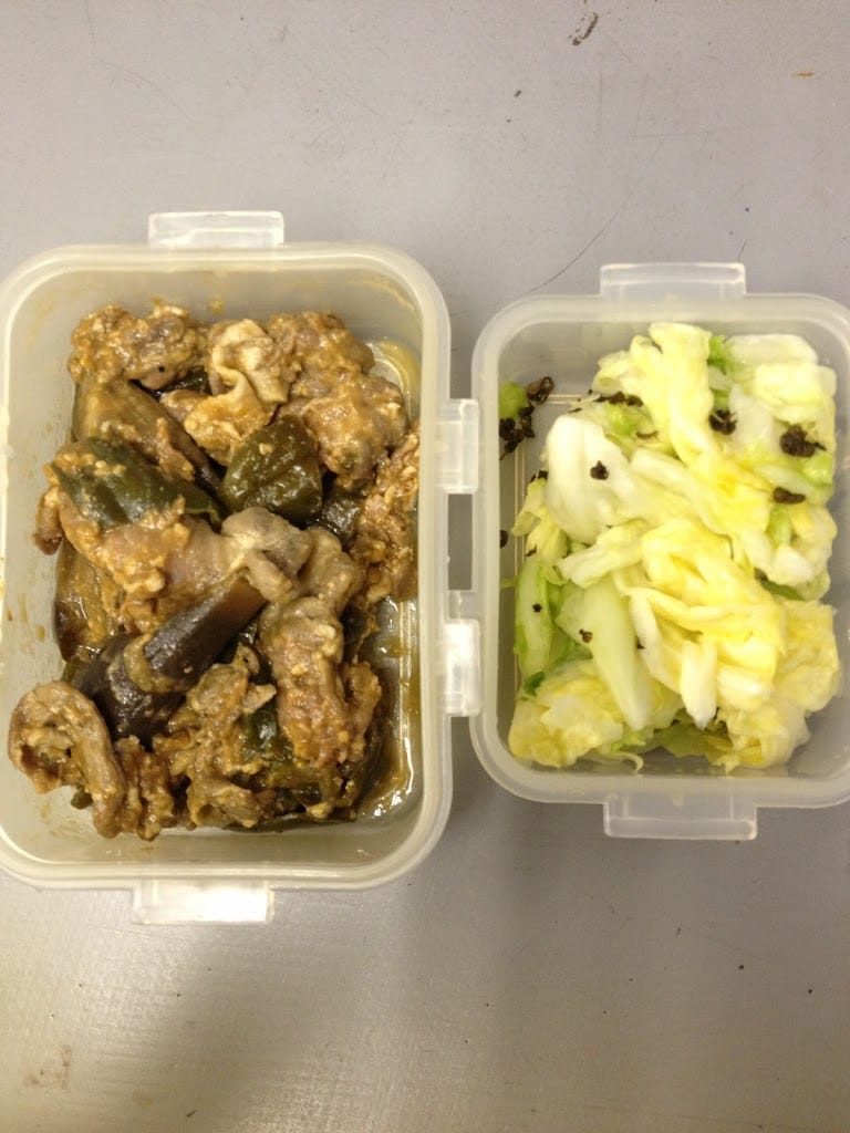 夕方:キャベツの塩もみとシソの実の塩漬け和え,豚肉となすピーマンの味噌炒め
