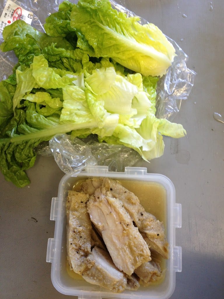 お昼:鳥の高野豆腐粉まぶし焼き 無水鍋にて とサンチュ