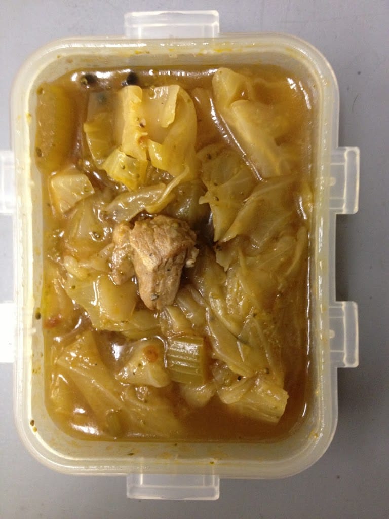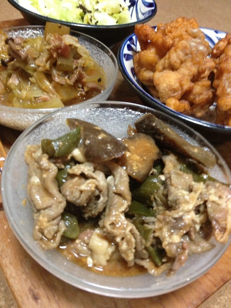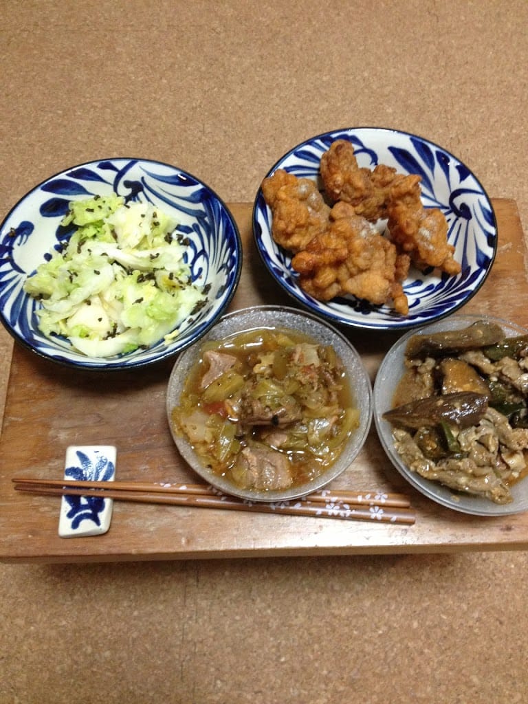 夜:スーパーの鳥のから揚げ,キャベツの塩もみとシソの実の塩漬け和え,キャベツと豚肉のスープ,豚肉となすピーマンの味噌炒め