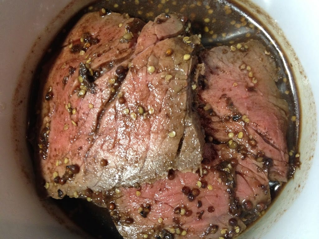 昨日残ったローストビーフを,ソースに漬けて冷蔵庫に入れておいたのです.