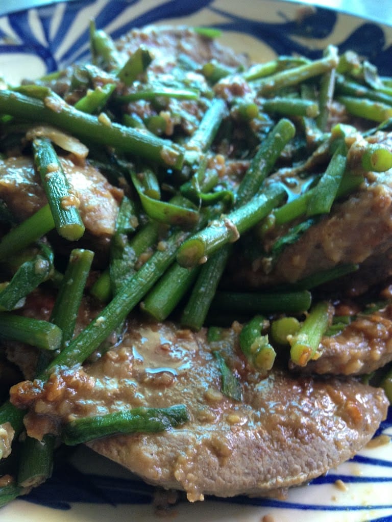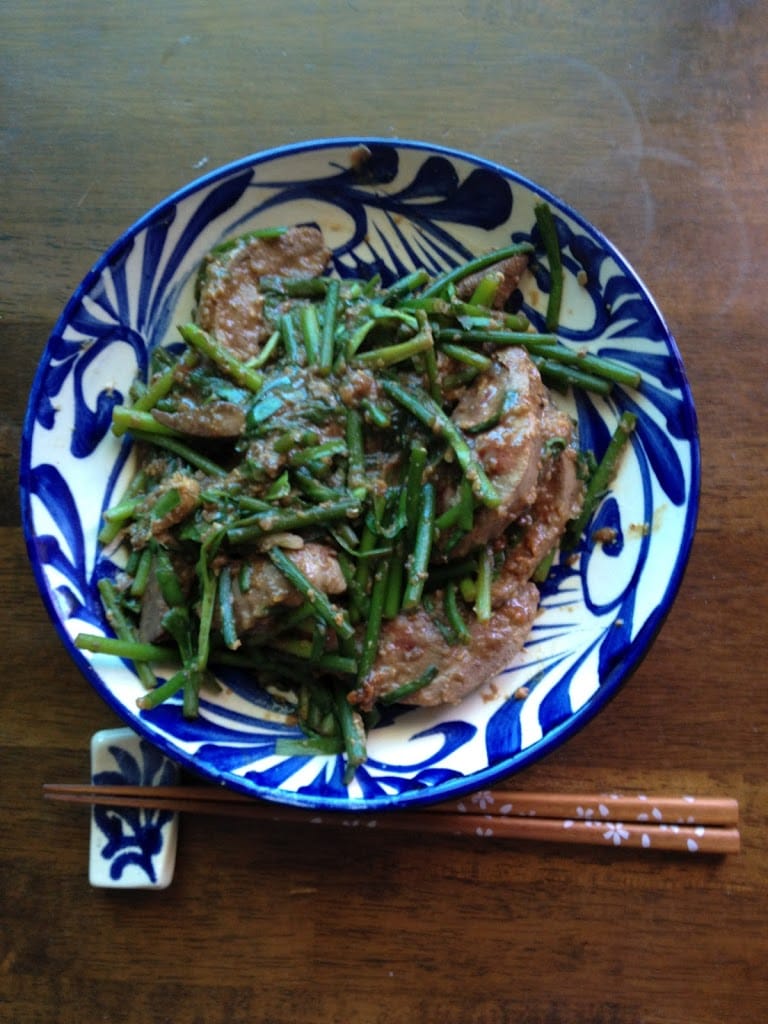 レバーを取り出して,ニンニクの芽をサッと炒めて,ニラを入れて,レバーを戻し,日本酒をテキトーに少々入れ,醤油を少しだけ入れ,おろし生姜をたっぷり入れ,てっぺんに自家製味噌を乗せ,フタをして弱火.