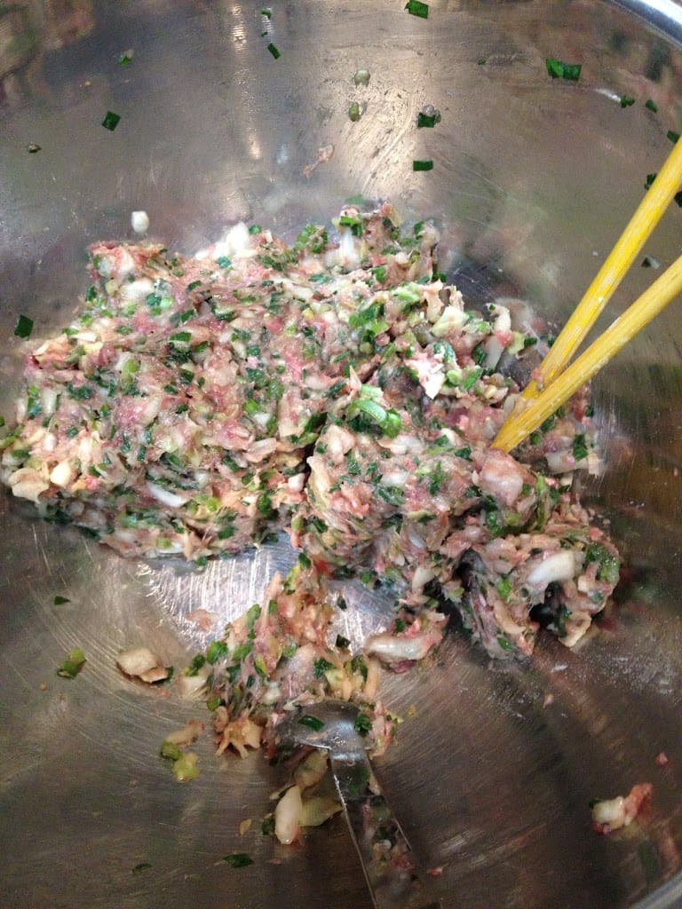 ひき肉と塩コショウ,塩もみ野菜,ニンニク,生姜をボールでよーーく練ります.