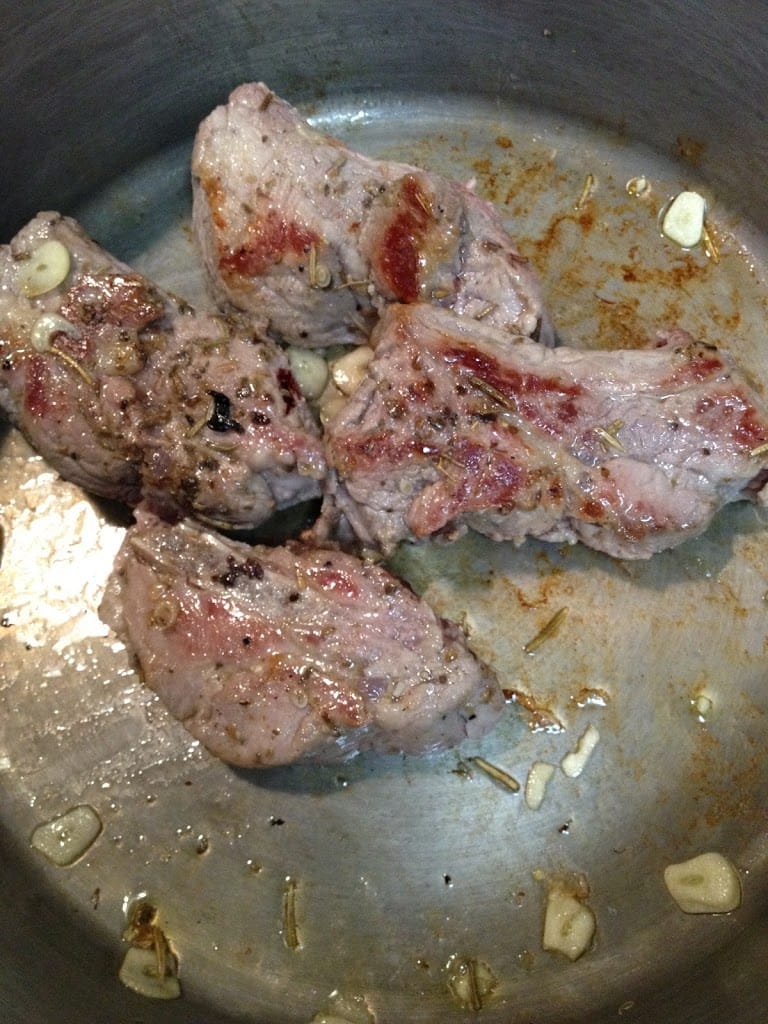 無水鍋にオリーブオイルをひいて,中火でお肉の両面に焼き色をつけます.