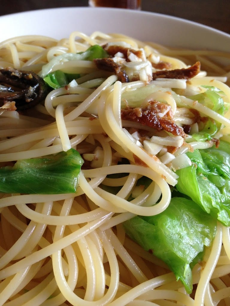 えー,お昼に何を食べましょうかと言うことで,レタスが何故か2玉あったので,アンチョビとレタスのパスタにしました.