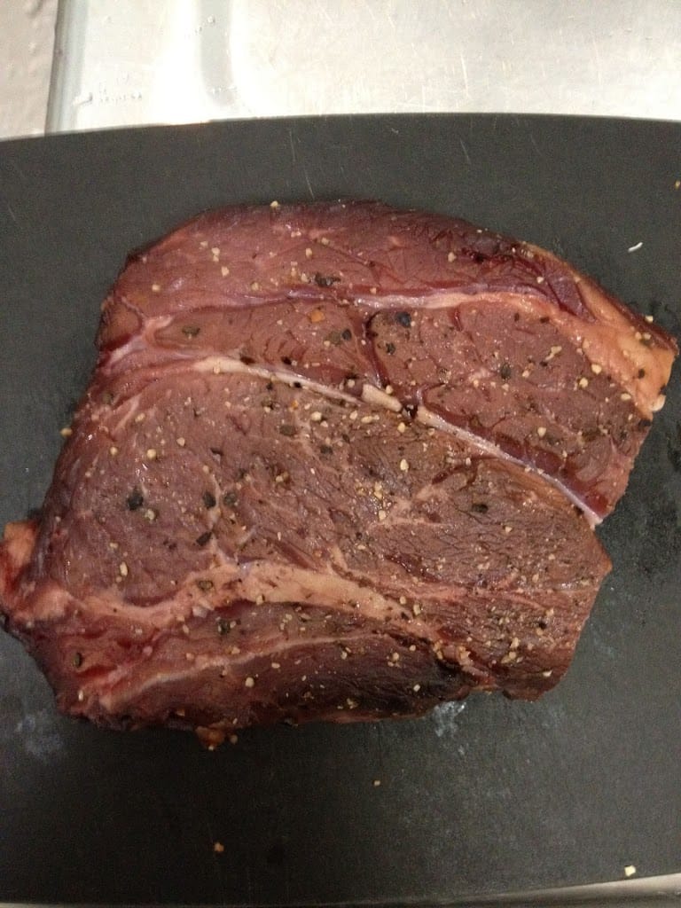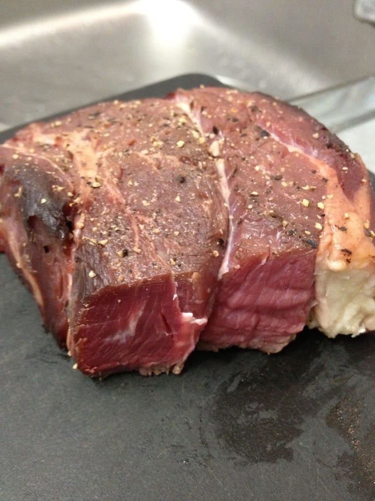 えー,例によって牛肉の(確かロースだったような・・・)かたまりが見切られていたので,購入しました.