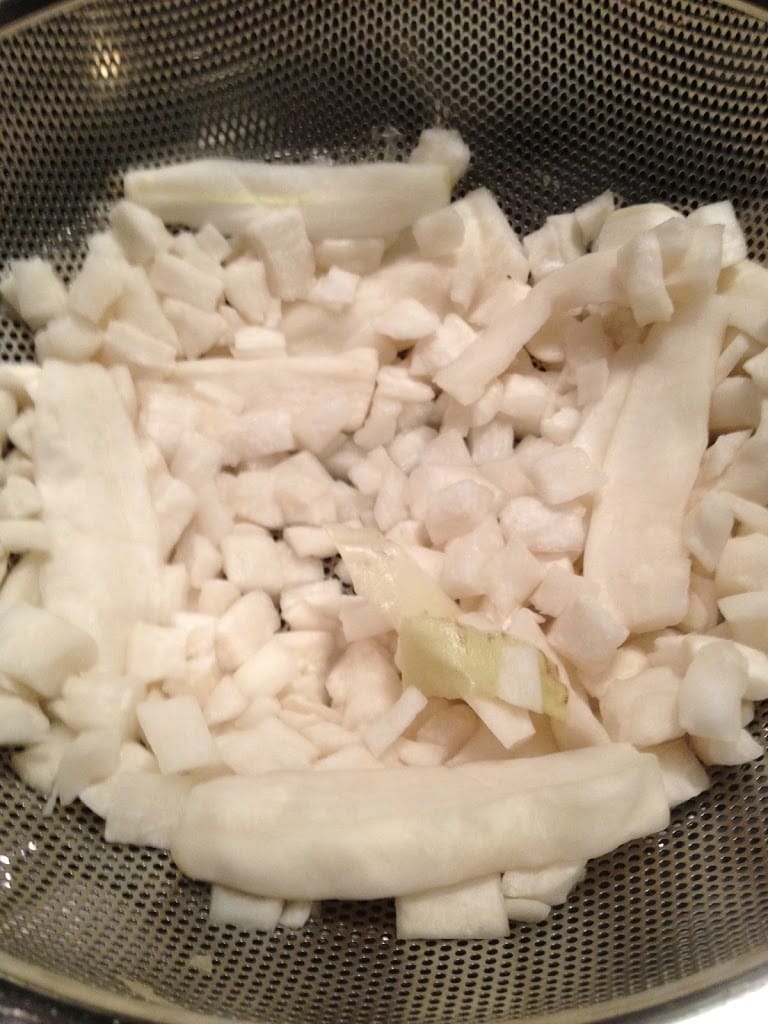 スーパーに行ったら,大根が安かったので,あてもなく買ってきました.大根おろしを飲んだりしましたが,限度がありますね.とりあえず塩をたっぷりとして,漬けました.サイコロ状と棒状の2種類にしました.