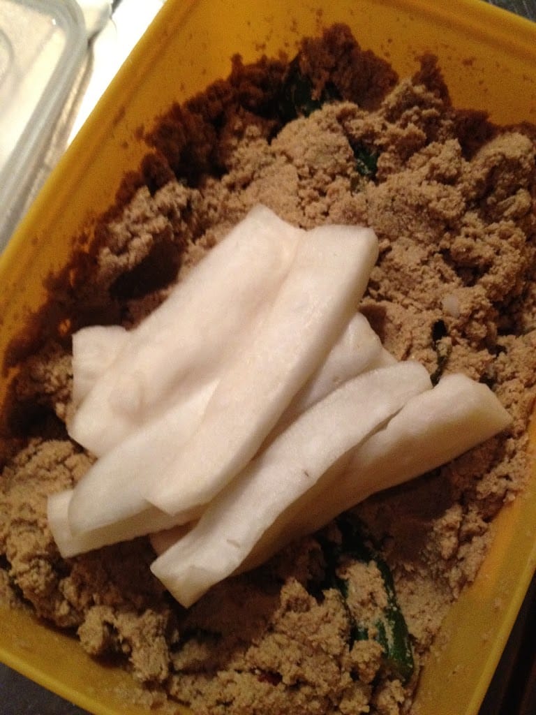 残りのサイコロと棒は,カクテキみたいなものにしたよ.前にね,かなりマトモにキムチを漬けたことがあるのよ.オキアミを入れたりしてさ.それもいいんだけど,簡単で何となく大丈夫なのもイイじゃないですか.今回は,韓国産一味と味噌だけにしました. コレで何となくそれっぽいもののような感じになったね. こうすると日持ちがして素敵です.