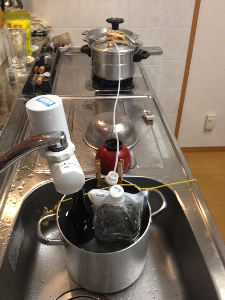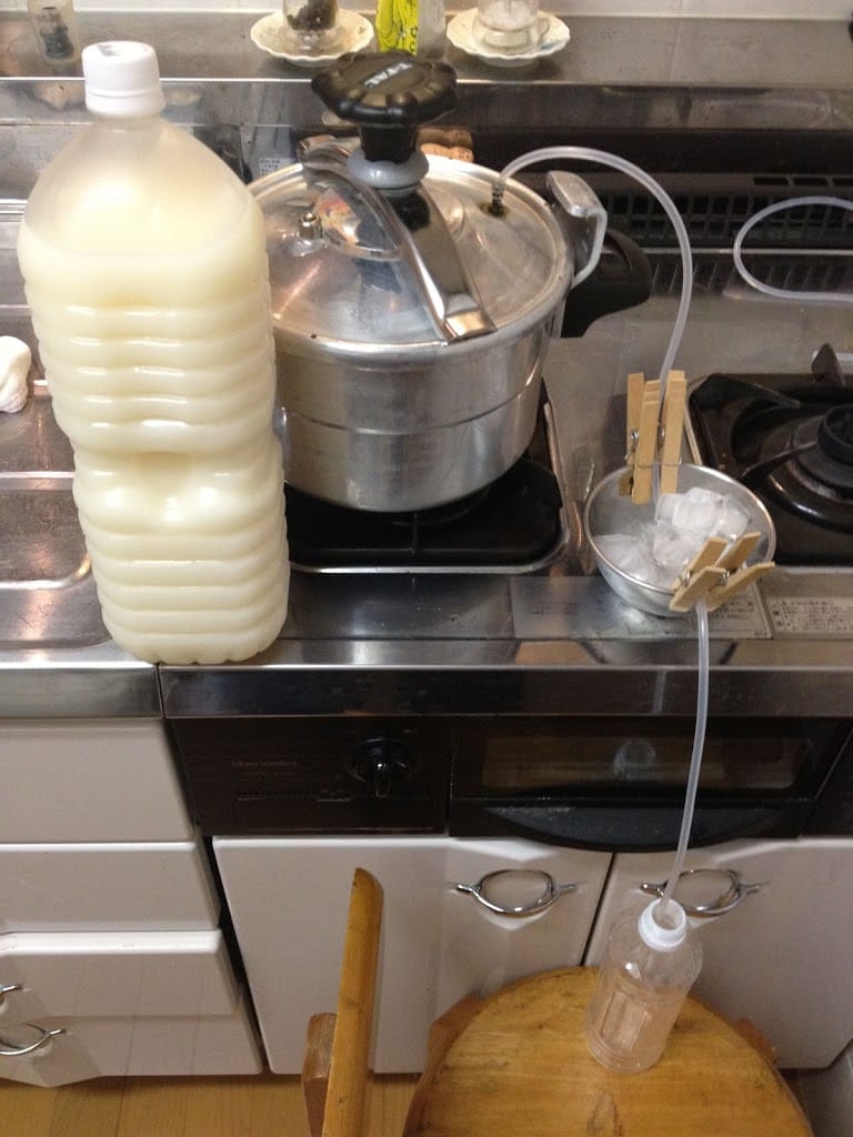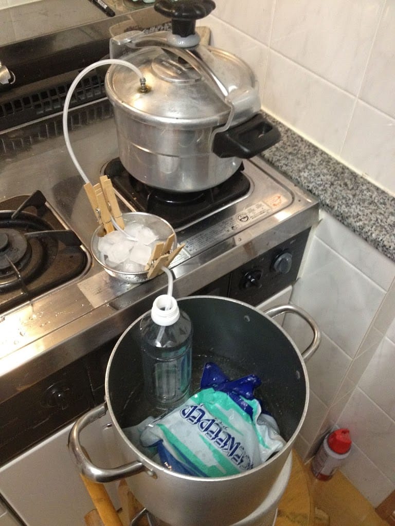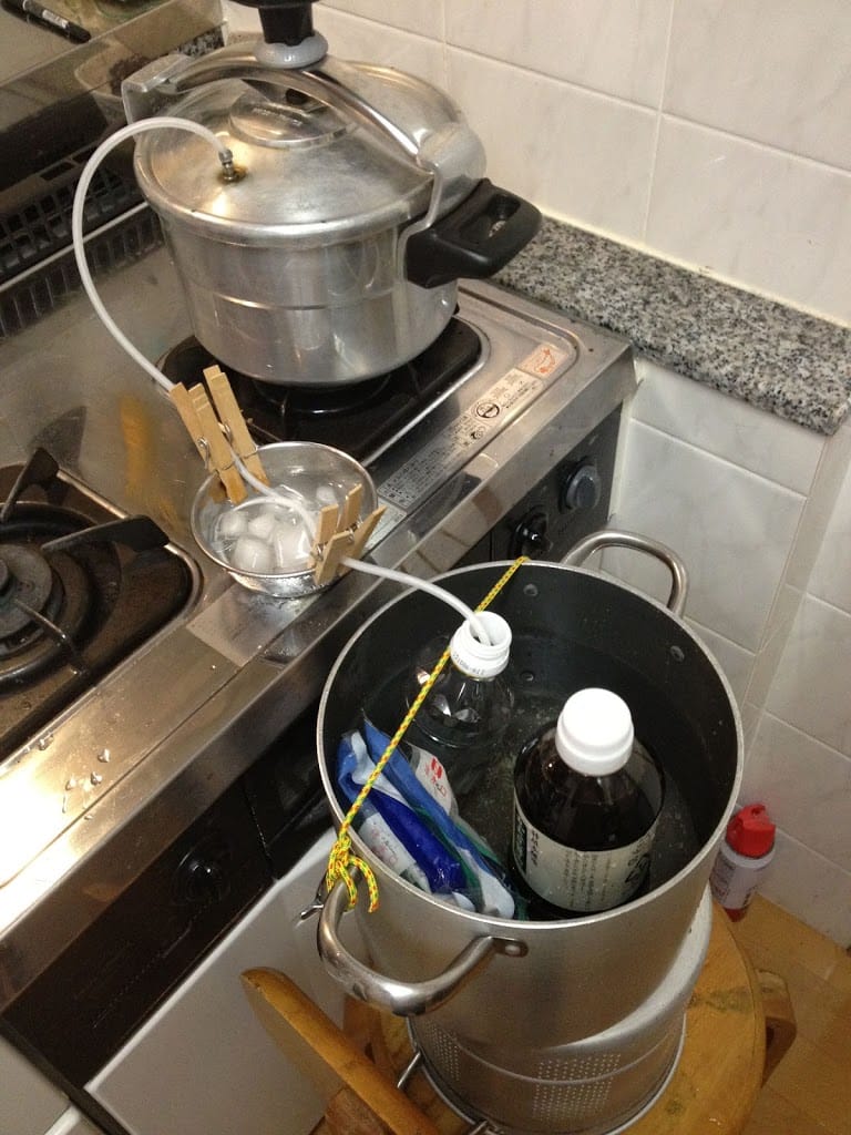 例のアレ2リットルを圧力鍋に入れます.フタをして,ハンドルを締めます.空気の出るところに,ビニールパイプをつけます.これがサイズがアレで,かなり無理やりだったわ.高温が予想されるので,途中に冷却装置をかましました.(機能せず)パイプの出口にペットボトルを置く.ペットボトルは鍋に入れて水冷.