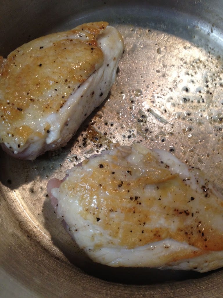 無水鍋にオリーブオイルをしいて,軽く熱し,鳥を皮目から焼きます.