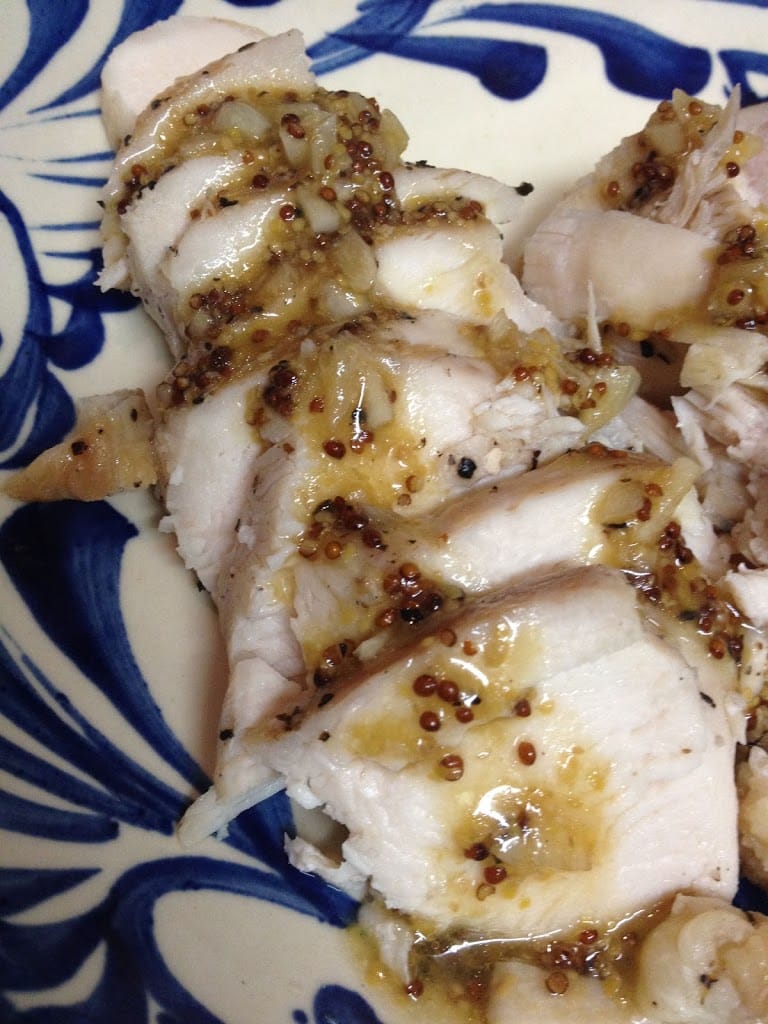 今日は鳥の蒸し焼き,粒マスタードソースかけですよ.
