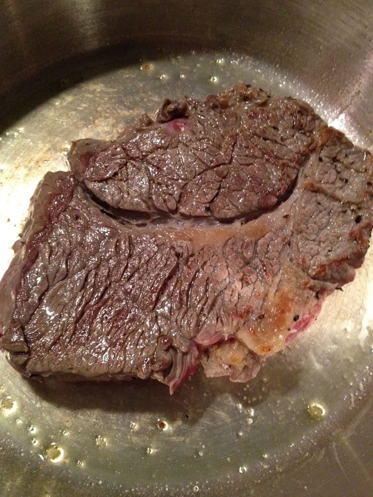 今日はぶ厚い牛肉のワインビネガーソースかけ,無水鍋使用ですよ.