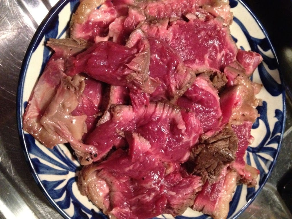 テキトーなトコでやめて,出来上がって切り終えたお肉にかけていただきます.