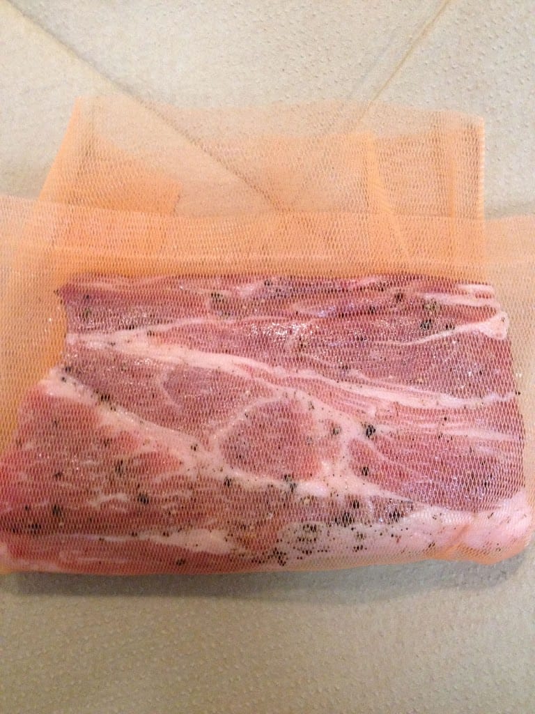 肉刺しで刺して,大目に塩コショウ,排水ネットでくるんで,キムタオル(実験系のキミ,わかるね)でくるみ,冷蔵庫にて熟成ですー.