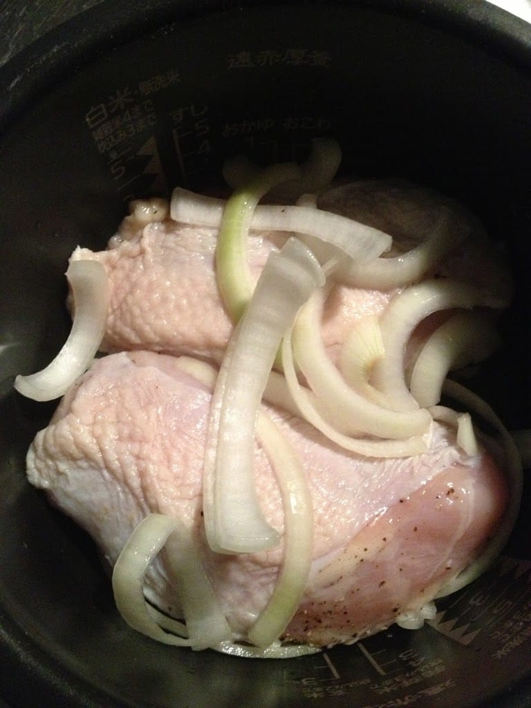 - 塩コショウした鳥を炊飯器に入れる