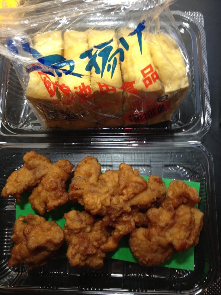 夜:スーパーの鶏のから揚げと,厚揚げ