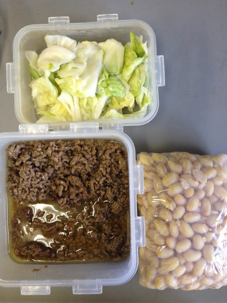 大豆とひき肉でパリパリたべ,合間にキャベツをバリバリです.