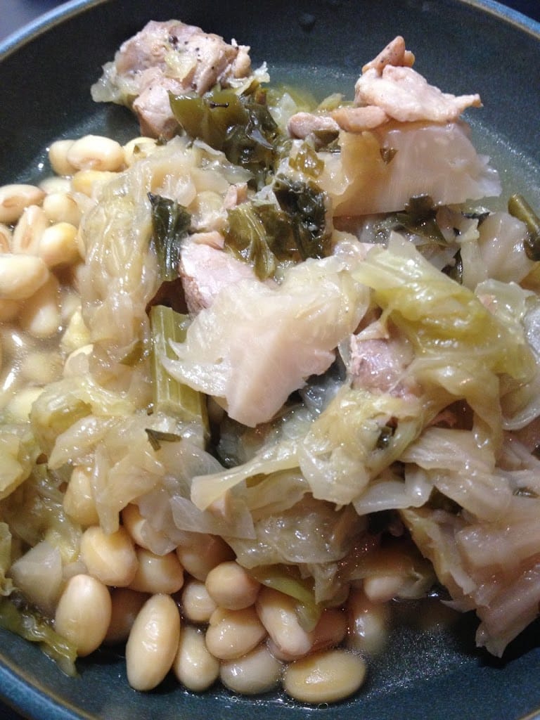 夜;鶏とキャベツ,セロリのスープと煮大豆