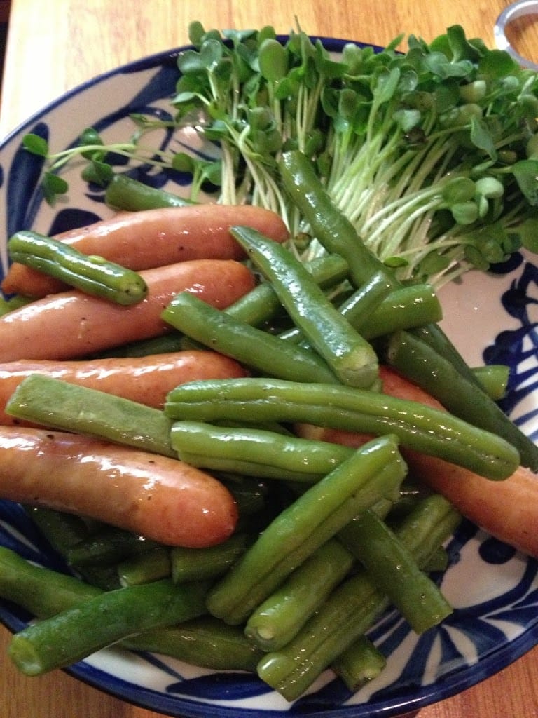 夜:茹でインゲンとソーセージ,貝割れ大根
