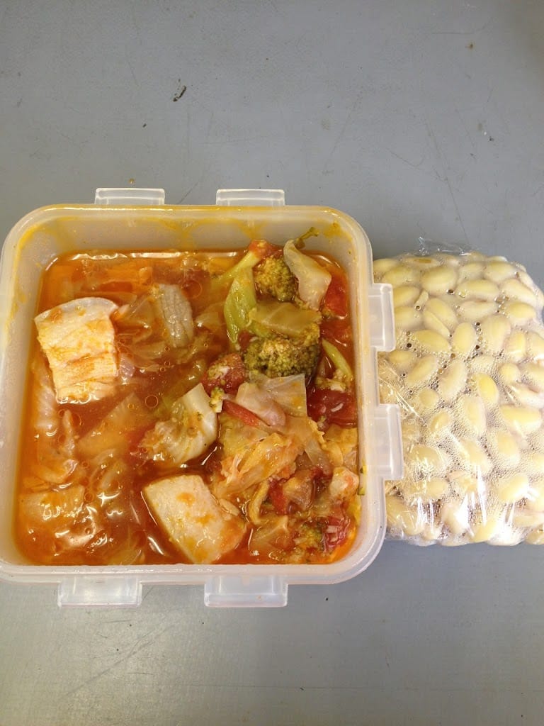 お昼:煮大豆と,豚肉とキャベツのスープ