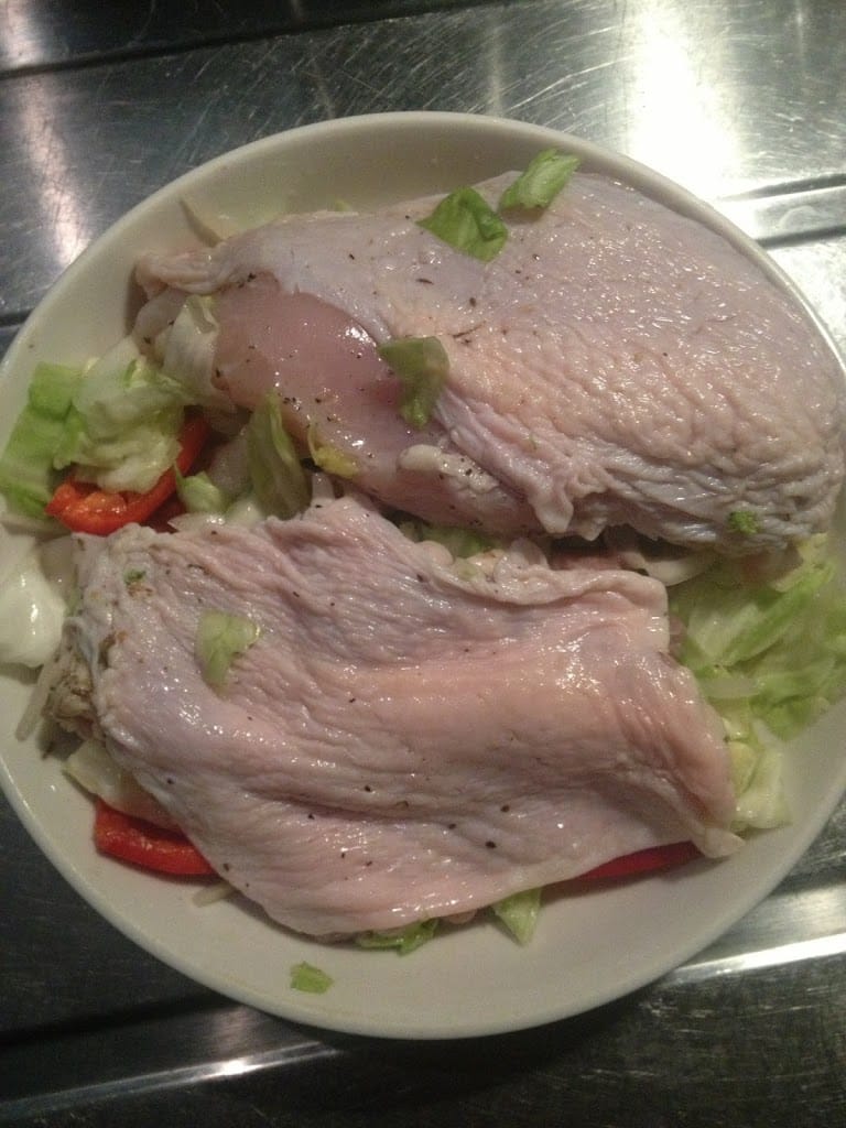 鶏肉に肉刺しをして,塩コショウしてしばし放置.