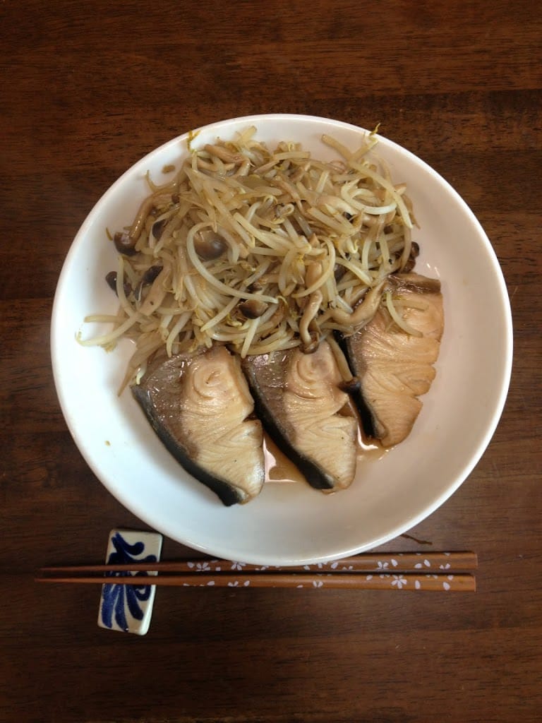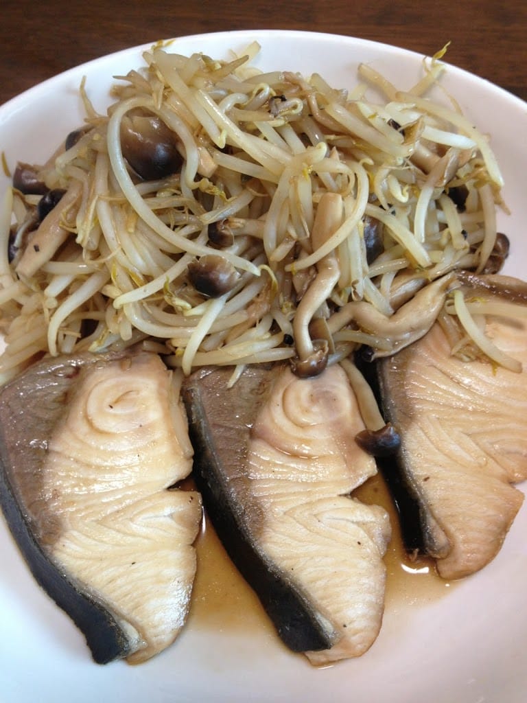 お昼:ぶりの照り焼き風と,もやしとシメジ炒め