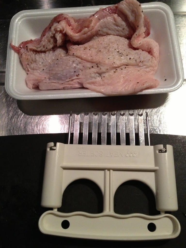鳥モモ肉に肉刺しをして,塩コショウ.